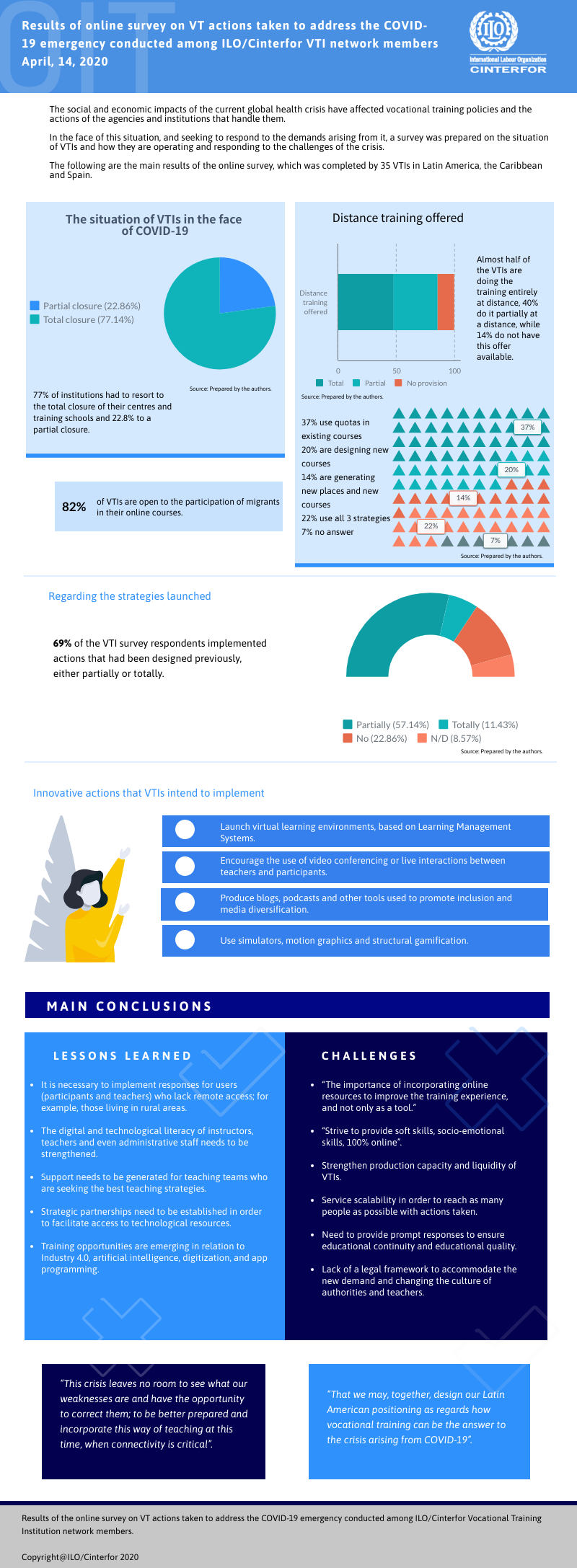 Infographic: results of the survey on the actions from the VT to face the emergency COVID-19 carried out to the VTI members of the ILO / Cinterfor network. Updated: April 2020