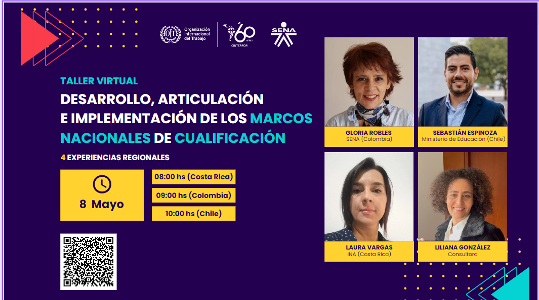 On 8 May we will hold a new videoconference in the framework of the ILO/Cinterfor - SENA 2024 agreement. This time the topic is: development and implementation of National Qualification Frameworks, through the approach of 4 experiences of implementation in the region: Chile, Costa Rica, Colombia and Panama. We will discuss achievements and challenges in the articulation of middle, technical and higher level qualifications, eventual uses of the NQF in the homologation of certificates with other countries and recommendations derived from recent experience.