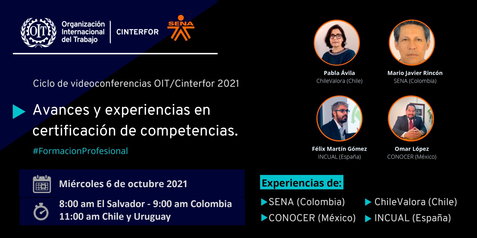 El miércoles 6 de octubre, se llevó a cabo la videoconferencia “Avances y experiencias en certificación de competencias”, en el marco del convenio OIT/Cinterfor – SENA. En esta oportunidad se expusieron 4 experiencias basadas en Chile, Colombia, España y México; a través de las instituciones Chilevalora, SENA, INCUAL y CONOCER.