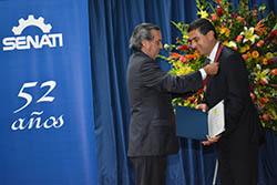 Lima, Perú, 19 de diciembre de 2013. El Consejo Nacional del SENATI acordó otorgar al Centro Interamericano para el Desarrollo del Conocimiento en la Formación Profesional (Cinterfor) la Condecoración en la Denominación Fundador con ocasión de celebrar esa prestigiosa institución de formación profesional de Perú 52 Aniversario de fundación. La entrega fue hecha durante la ceremonia conmemorativa en presencia de altas autoridades, Embajadores de países cooperantes, Cuerpo Diplomático y gran número de empresarios por el presidente del Consejo Nacional, Aurelio Rebaza al Oficial a cargo de Cinterfor, Fernando Vargas.</p><p>La condecoración le fue otorgada en consideración a su contribución al desarrollo y la gestión institucional del SENATI tomando en cuenta las siguientes líneas de acción prestadas por Cinterfor: el servicio de información y documentación sobre formación profesional; las reuniones bienales de la Comisión Técnica del Cinterfor con la participación de los directivos de las instituciones de formación profesional; el fomento de proyectos de cooperación Sur Sur en formación profesional; y el patrocinio de misiones de cooperación técnica y asistencia técnica a favor de las instituciones de formación profesional de la Red OIT/Cinterfor.</p><p> </p>