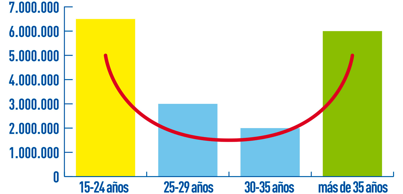 Participación alta en los tramos de 15-24 años y para mayores extremo- y baja en los tramos 25-29 y 30-35 años -el medio.