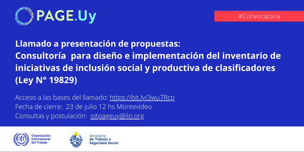 En este marco, desde PAGE Uruguay se convoca a la presentación de propuestas para el acompañamiento técnico del proceso de elaboración y puesta en funcionamiento del Inventario de Iniciativas de Inclusión Social y Productiva de clasificadores, su relevamiento inicial, así como el fortalecimiento de las capacidades del equipo técnico del MTSS para su visualización, requerimientos y gestión.